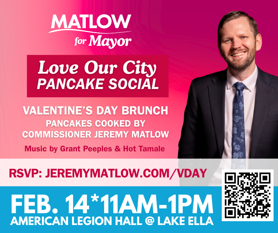 🍓🥞♥️ with Jeremy Matlow Musical Guests: This Valentine’s Day, let’s show some love for Tallahassee — by coming together for good food, good music, and a hopeful future for our city.